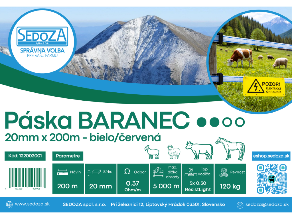 Kvalitná páska pre elektrický ohradník Baranec, bielo/červená, 20 mm / 200 m je kvalitný vodič určený pre elektrické ohradníky pre dobytok, ovce, kozy aj kone. Vďaka kontrastnému bielo/červenému prevedeniu je páska veľmi dobre viditeľná, čo pomáha zvieratám lepšie vnímať hranicu ohrady a zvyšuje bezpečnosť celého oplotenia.